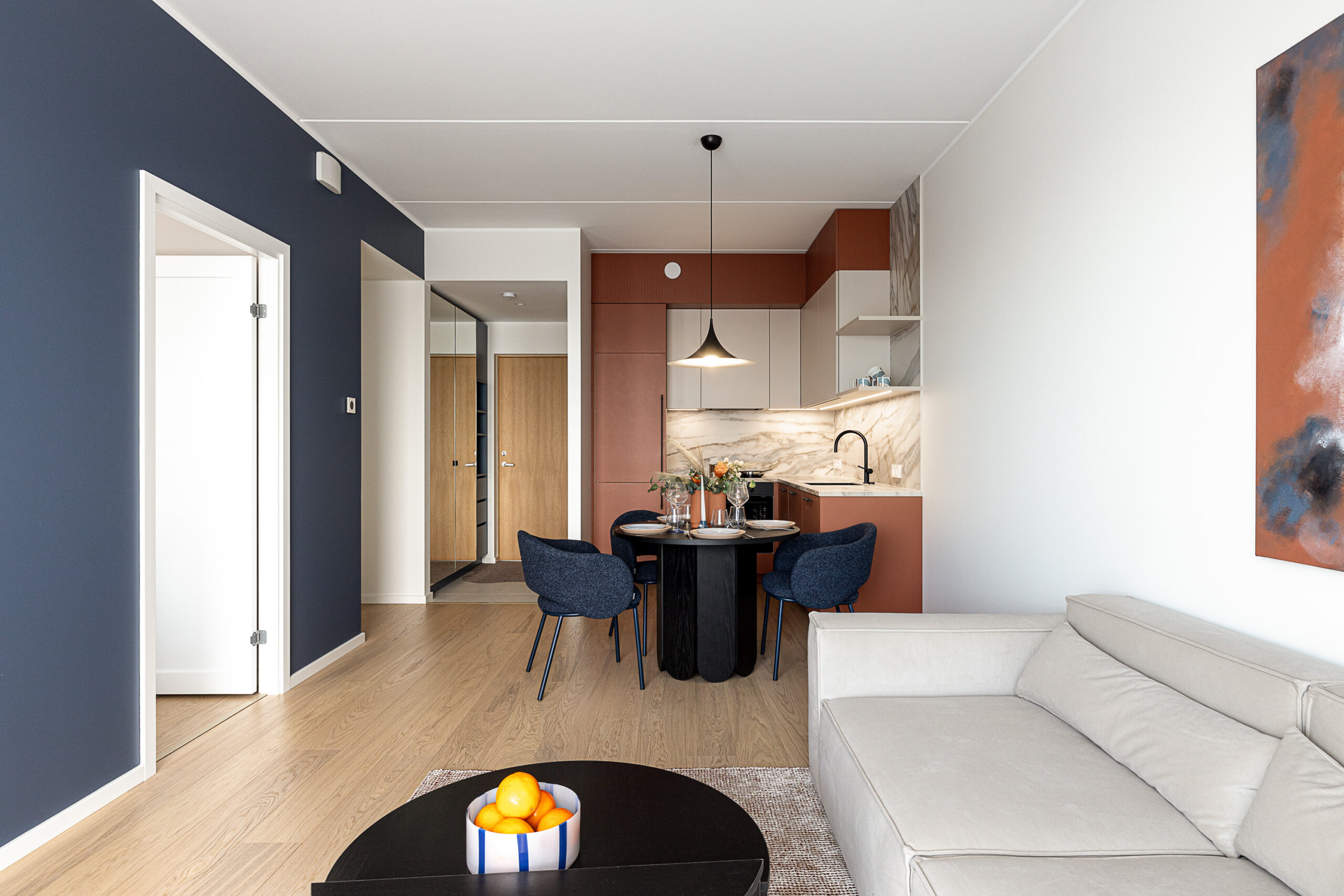 Väga sarnase värvipaleti leiame Merko näidiskorterite hulgast Lahekalda arendusest. Vaata seda mõnusat kahetoalist kodu, mille on kujundanud Triinu Aruoja: