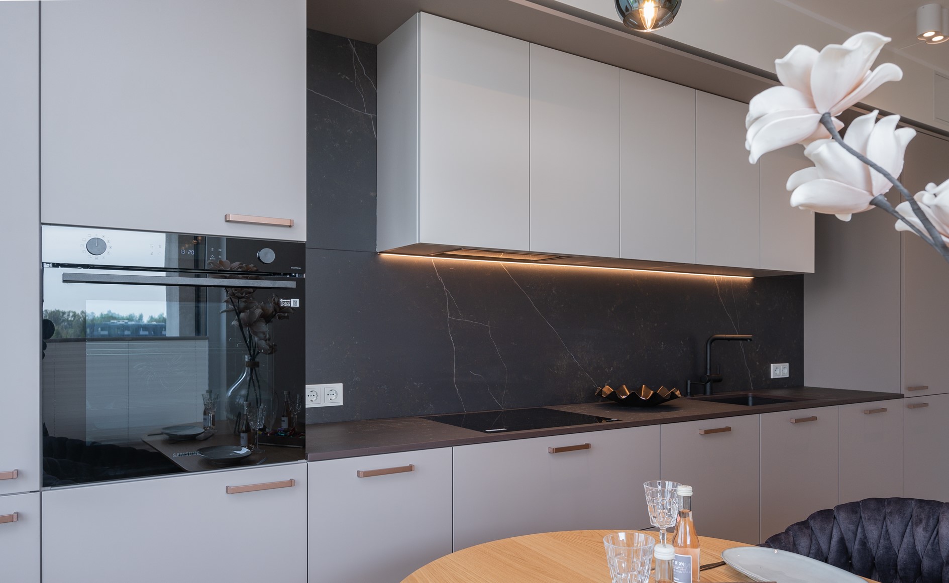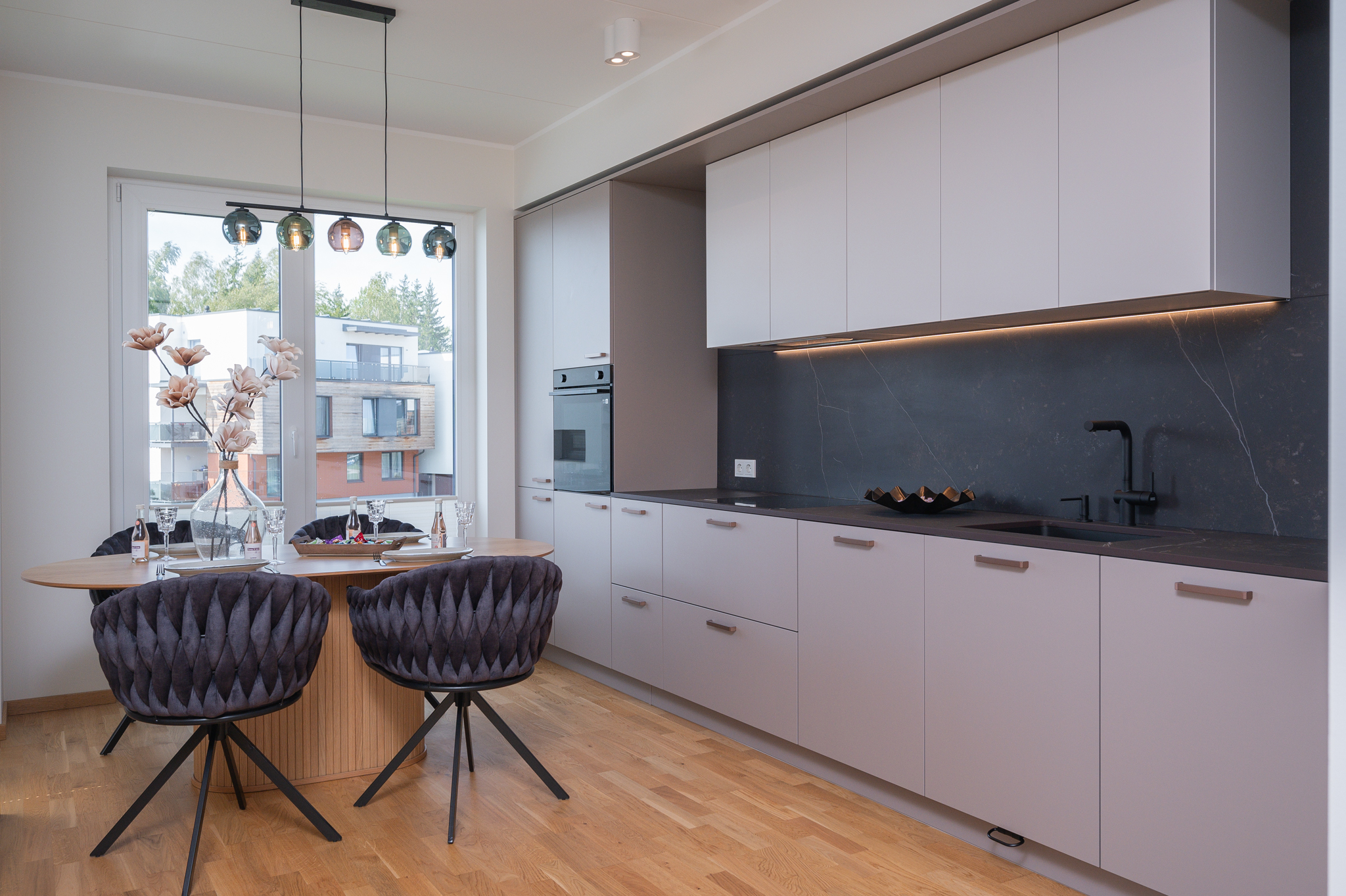 Kvaliteetse ja silmapaistva köögimööbli valmistas korterisse eritellimusmööblit pakkuv Schmidt Estonia. Kuna tegemist on küllaltki suure köögiga ja kapiruumi alumises reas piisavalt, siis on ülemises reas kappe tavapärasest vähem. Sellise lahendusega tuleb ilusasti esile ka töötasapinnal ja tagaseinas kasutatud Dekton keraamika, mis on kuuma- ja kraapimiskindel.