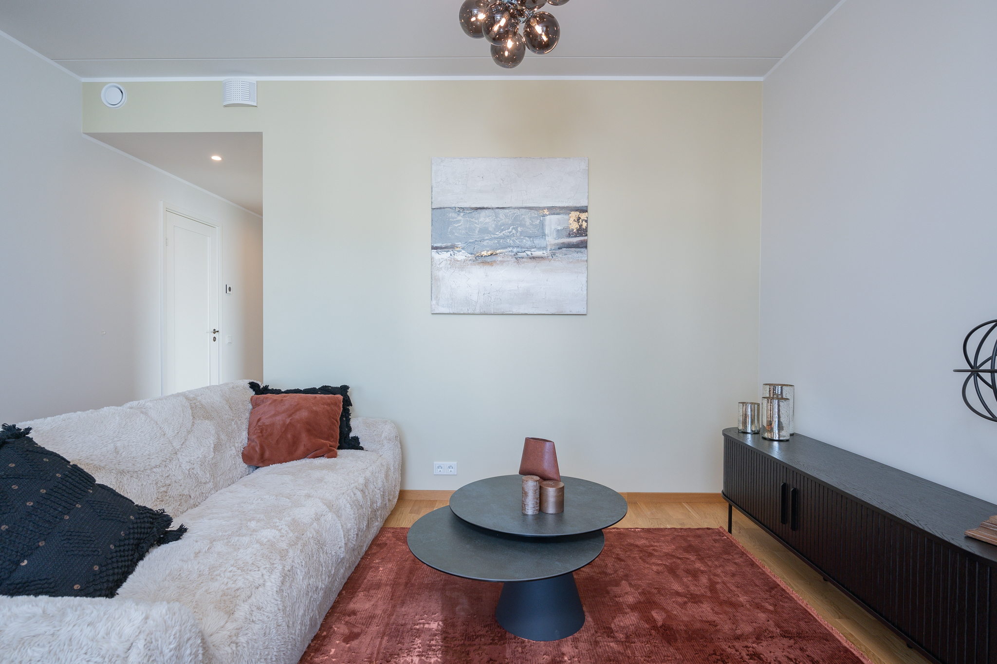 Elutoa keskpunktiks on pehme Buffalo diivan, mis lausa kutsub istet võtma ja mõnusalt lõõgastuma. Diivanilaud on pöörleva mehhanismiga, võimaldades selle osasid kasutada ruumisäästlikult üksteise peal või lahti keeratult suure lauana. Telerialus on söögilauaga samas stiilis, kuid tume, ning roostekarva vaip Studio seob kõik need elemendid hubaseks tervikuks.