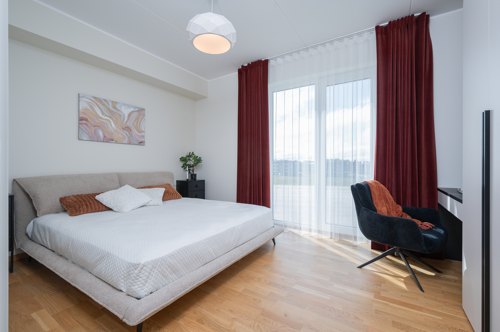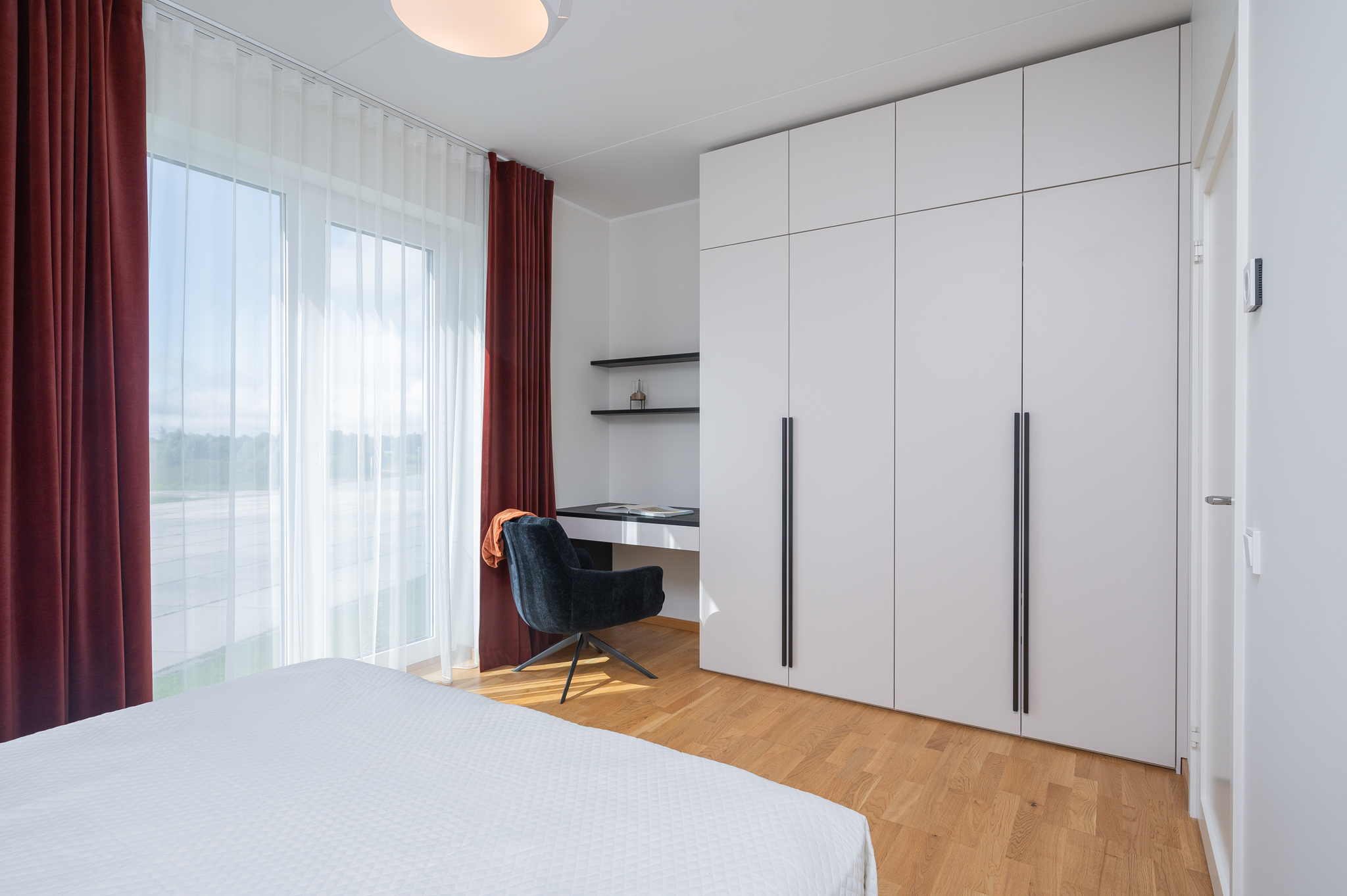Magamistoas püüab pilku Schmidti valmistatud mahukas garderoob, mida täiendab kodukontoriks sobiv laud koos riiulitega. Lisaks on toas stiilne voodi Sandy, millele lisab iseloomu ümbriku stiilis voodipeats. Kogu korteri kardinad on valminud kardinasalongis Blinder.