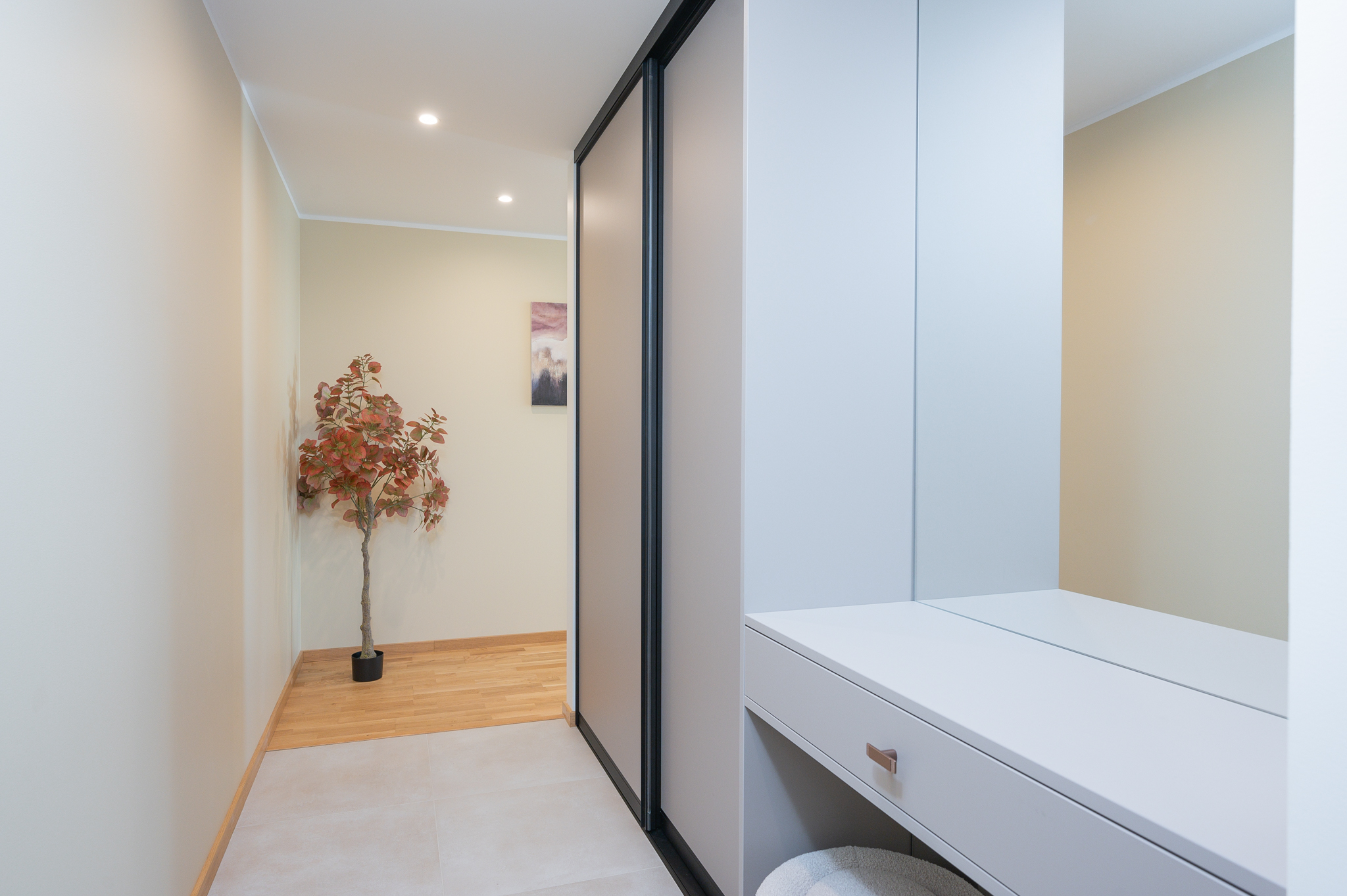 Ka esikus oleva garderoobi juurde kuulub sahtliga laud, millele saab koju jõudes näiteks võtmed või nutiseadmed asetada. Lisaks on tööpinna all tumba, mis muudab eelkõige jalanõude jalga panemise ja ära võtmise hulga mugavamaks, kuid teisalt pakub istujale ka võimaluse põgusaks puhkehetkeks koos iseenda peegelpildiga.