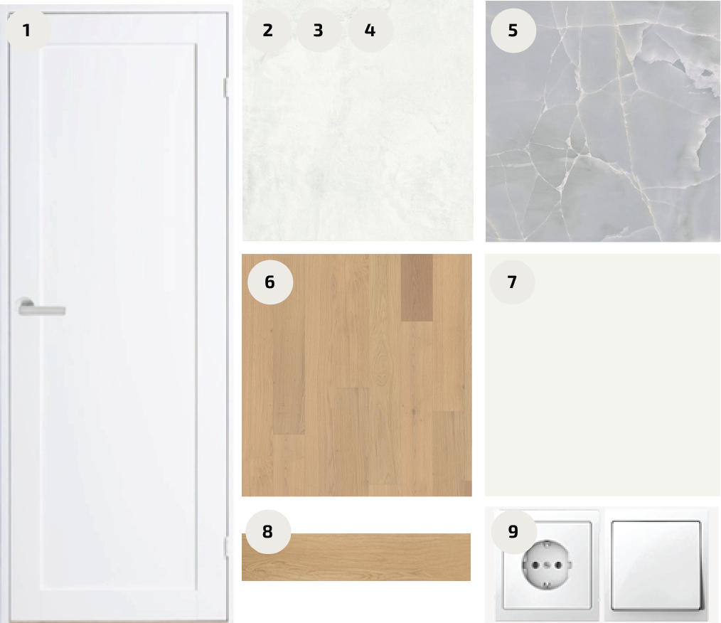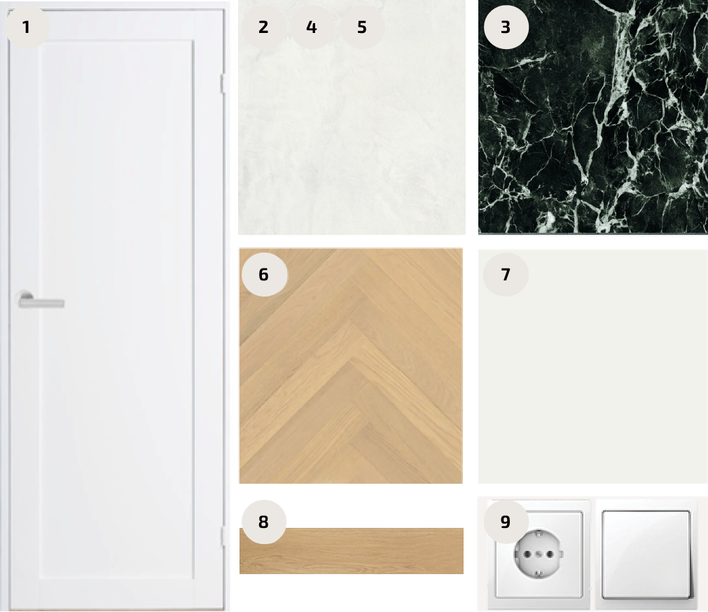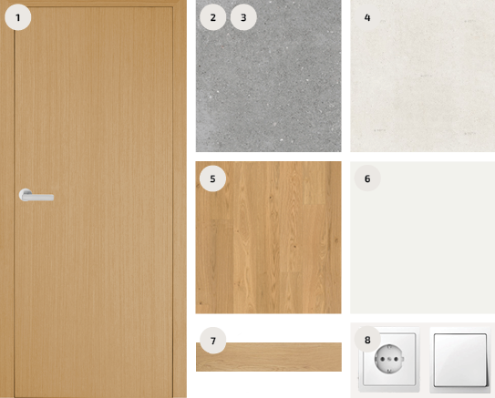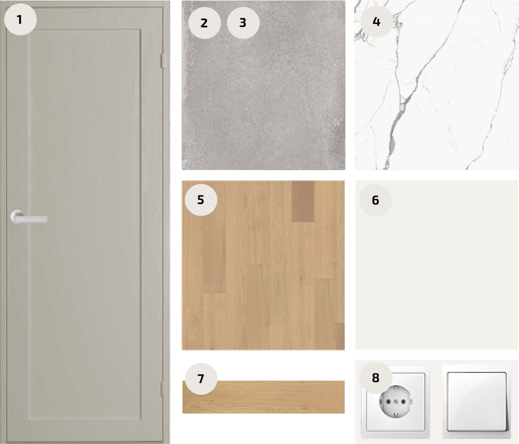 Carrara marmor on valik neile, kes hindavad elegantset, heledates toonides ja ajatult maitsekat sisekujundust. Paketti iseloomustavad tammeparkett, hallid keraamilised plaadid ja pehmes hallis toonis siseuksed. Valged ja kroomitud detailid lisavad skandinaavialikku kergust ja modernsust.