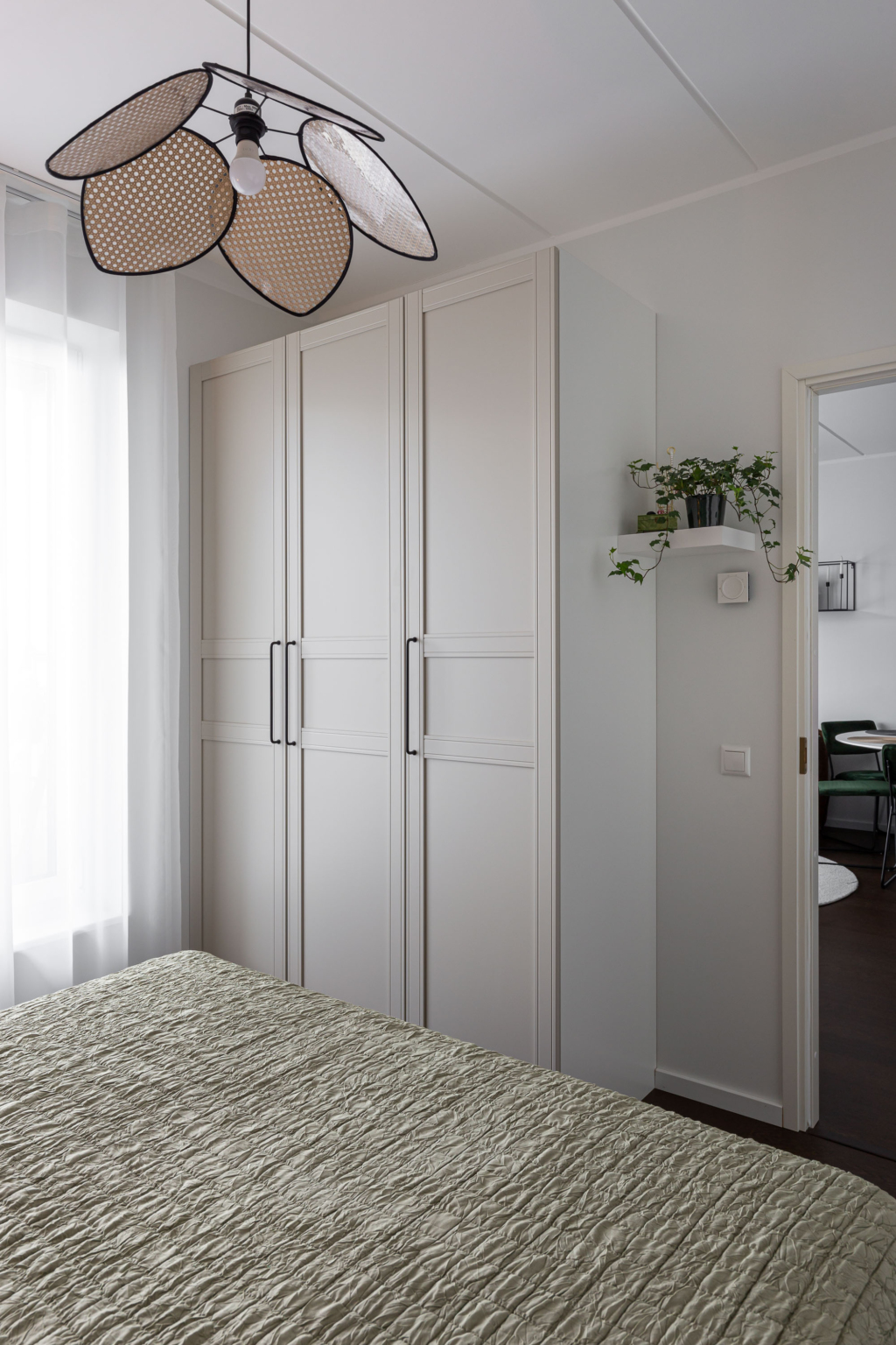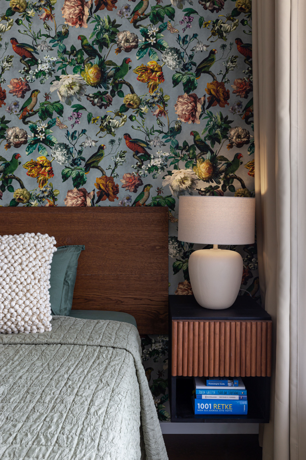 Ka magamistoa tapeet on üpriski metsik – lehtede ja lindudega, ent siiski maalähedaste toonidega. Looduserütmidest pungil aktsentseina, ise meisterdatud voodi ja öökappide seltsis on uni väga hea.