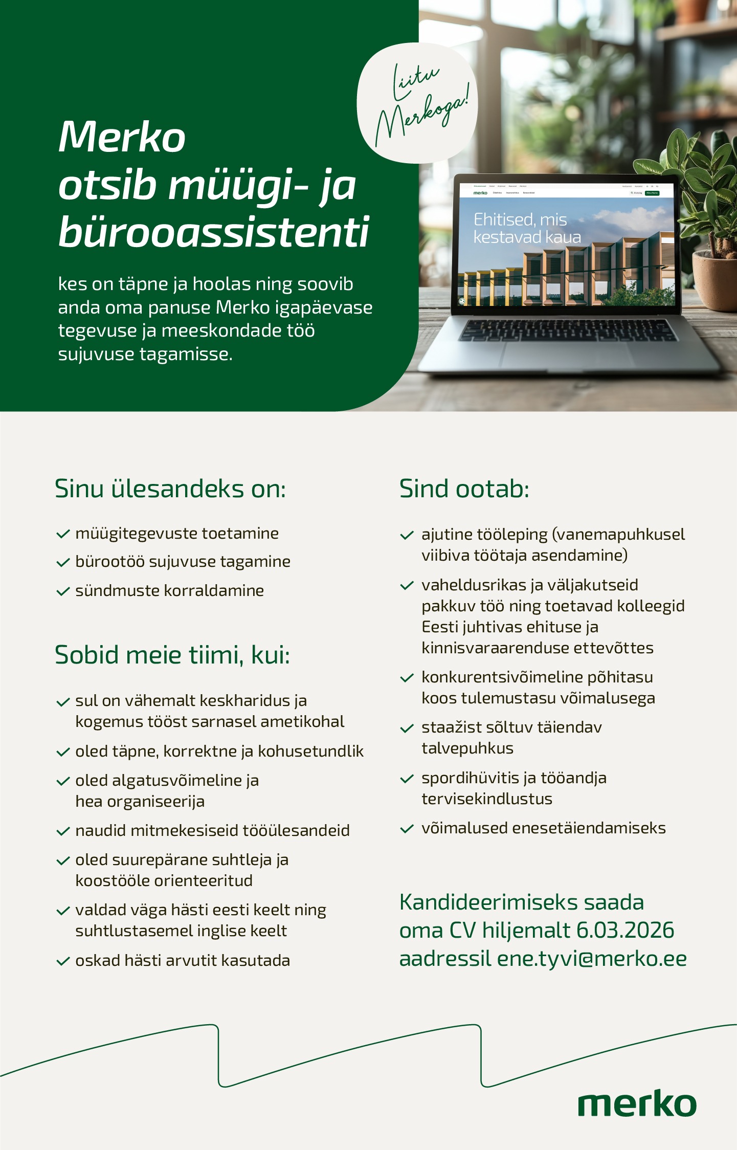 Meil saad kasvada ja õppida, sest kõik meie projektid on kordumatud ja nõuavad nutikust. Merkos saad kogemusi ja uusi oskusi nii töölt kui ka koolitustelt.
