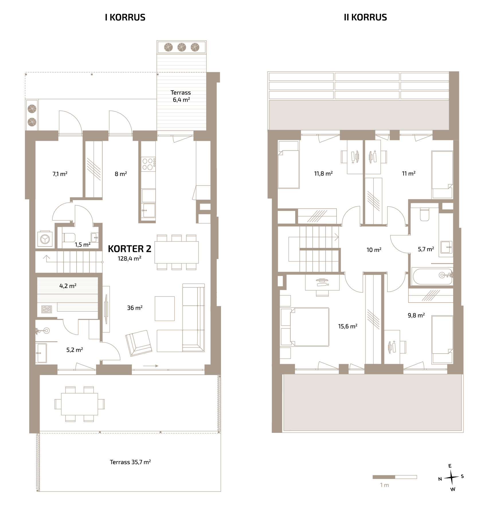 Kõikidel boksidel on kaks terrassiala – maja esine 6-7m2 suurune terrass, kus saab hommikupäikest nautida ja suuremad hoovilale avanevad terrassid on suurustega 35-64m2.