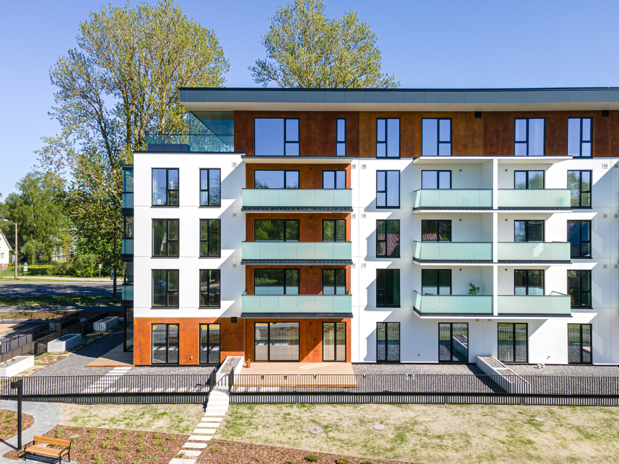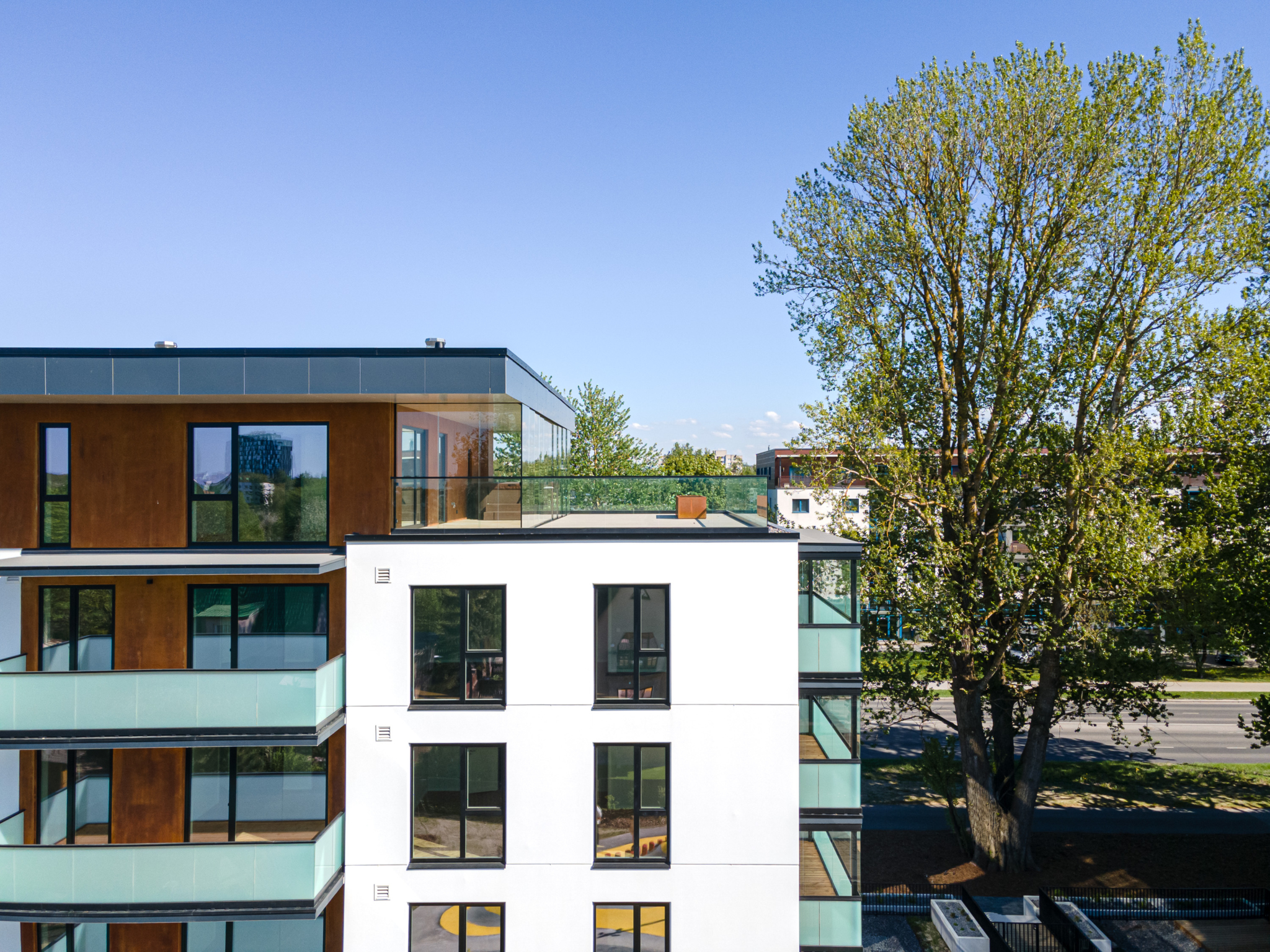 Korterite väärtust suurendavad kindlasti ulatuslikud laiad rõdud ja suured katuseterrassid viiendal korrusel ning maapealsed terrassid esimesel korrusel. Tänava poole jäävad rõdud on klaasitud, moodustades topeltfassaadi, millest tulenevalt on toas hubane ja vaikne ning ei saa arugi, et kodu nõnda suure tänava ääres asub. Hoone fassaadid on kavandatud esinduslikena, suurte akende ja avarate klaasfassaadidega trepikodadega, mis liigendavad hoonemahte ja juhivad valgust hoone sisemusse.