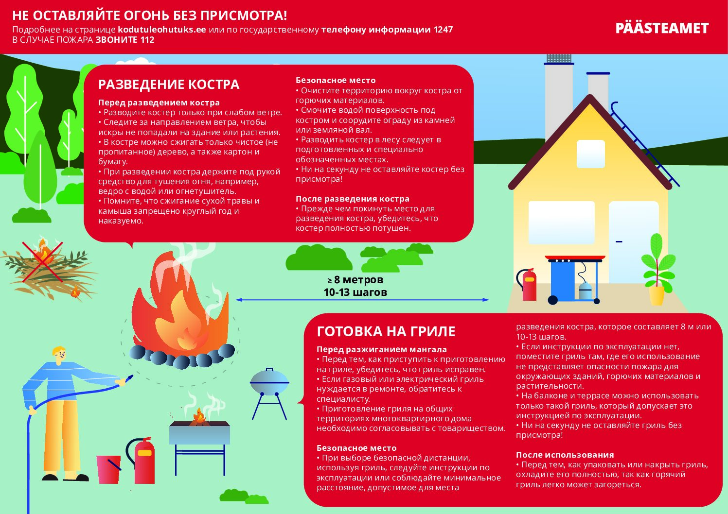Обязательно ознакомьтесь с постановлением министра внутренних дел «Требования к разведению костров и площадкам для гриля» и инструкциями Департамента спасения.
