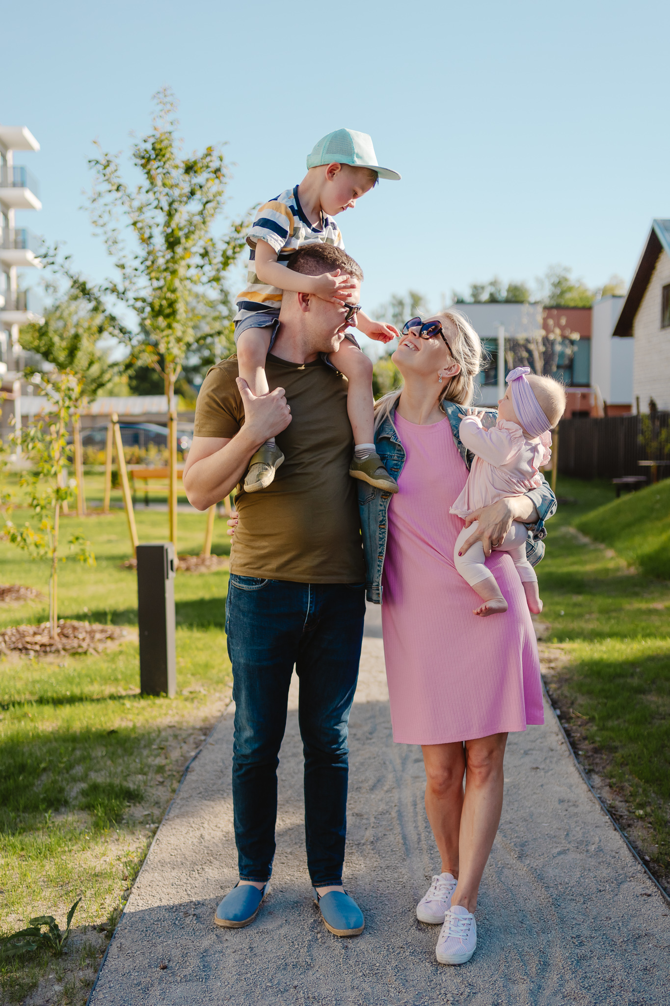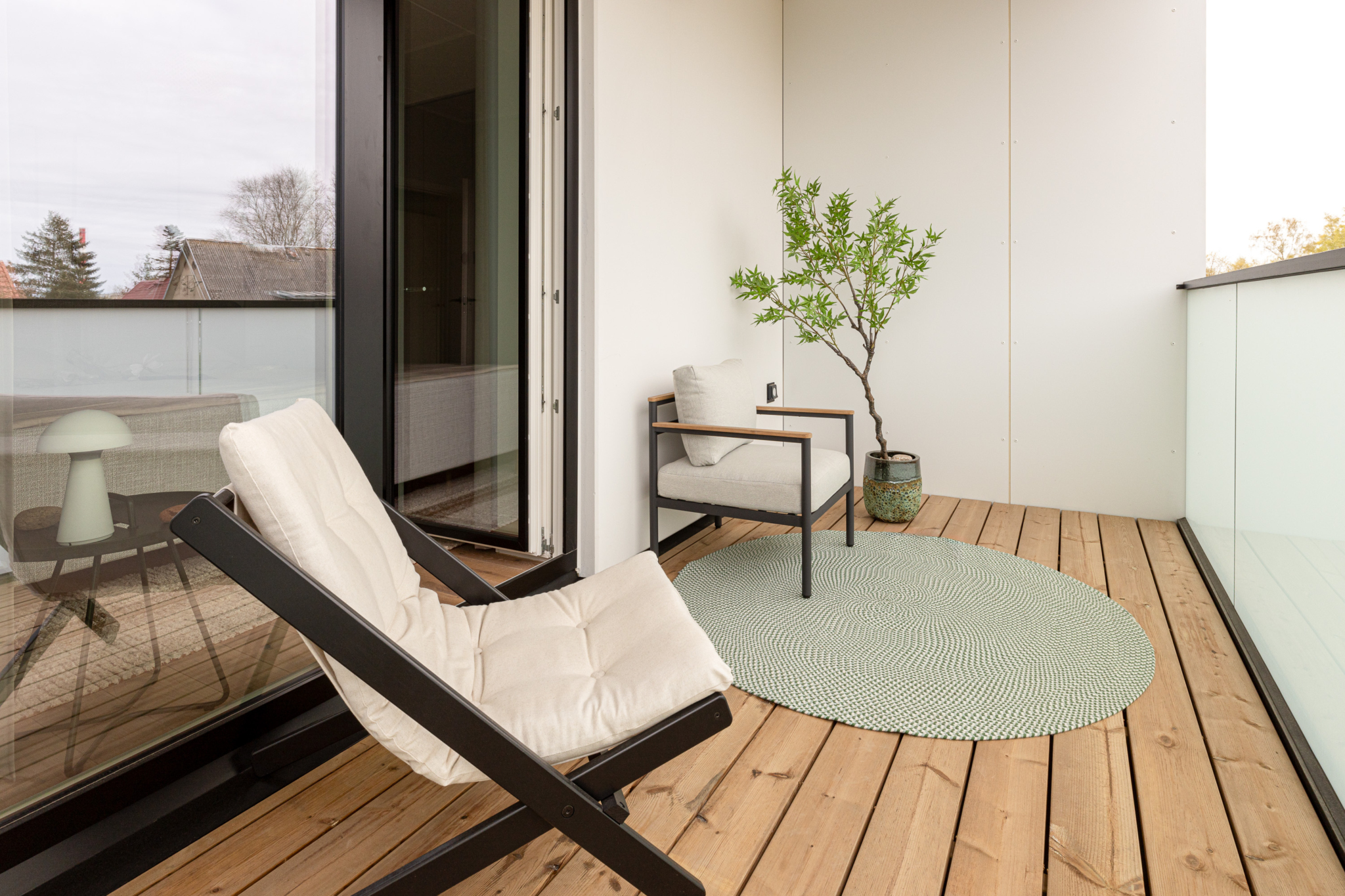 Rõdud on aga selle korteri ja arenduse eriline uhkus. Antud näidiskorteri planeering on läbi korruse, mis võimaldab kodus nautida nii hommiku- kui õhtupäikese võlusid. Sõpruse puiestee-poolsel pikal klaasitud lodžal (lausa 14 m2), mis avaneb elutuppa, saab tunda linna tuiksoone lähedust, kolides sinna oma hommikukohviga ja näpistades samas mõne ürdi omleti peale või jutustades külalistega välidiivanil ja kasutades lodžat kui elutoa mõnusat pikendust. Nii mööbel kui taimekast on pärit OCCO mahukast veebipoest. Magamistoa-poolsel rõdul saab lebotada lamamistoolis, nautida päikeseloojangut ja vaateid viljapuudega sisehoovile. Kui istekohti juurde vaja, võib töölaua tagant õue tõsta ka tiigipuidust tooli. Sumedat valgust annavad augustiõhtutel niiskuskindlad akutoitel laualambikesed.