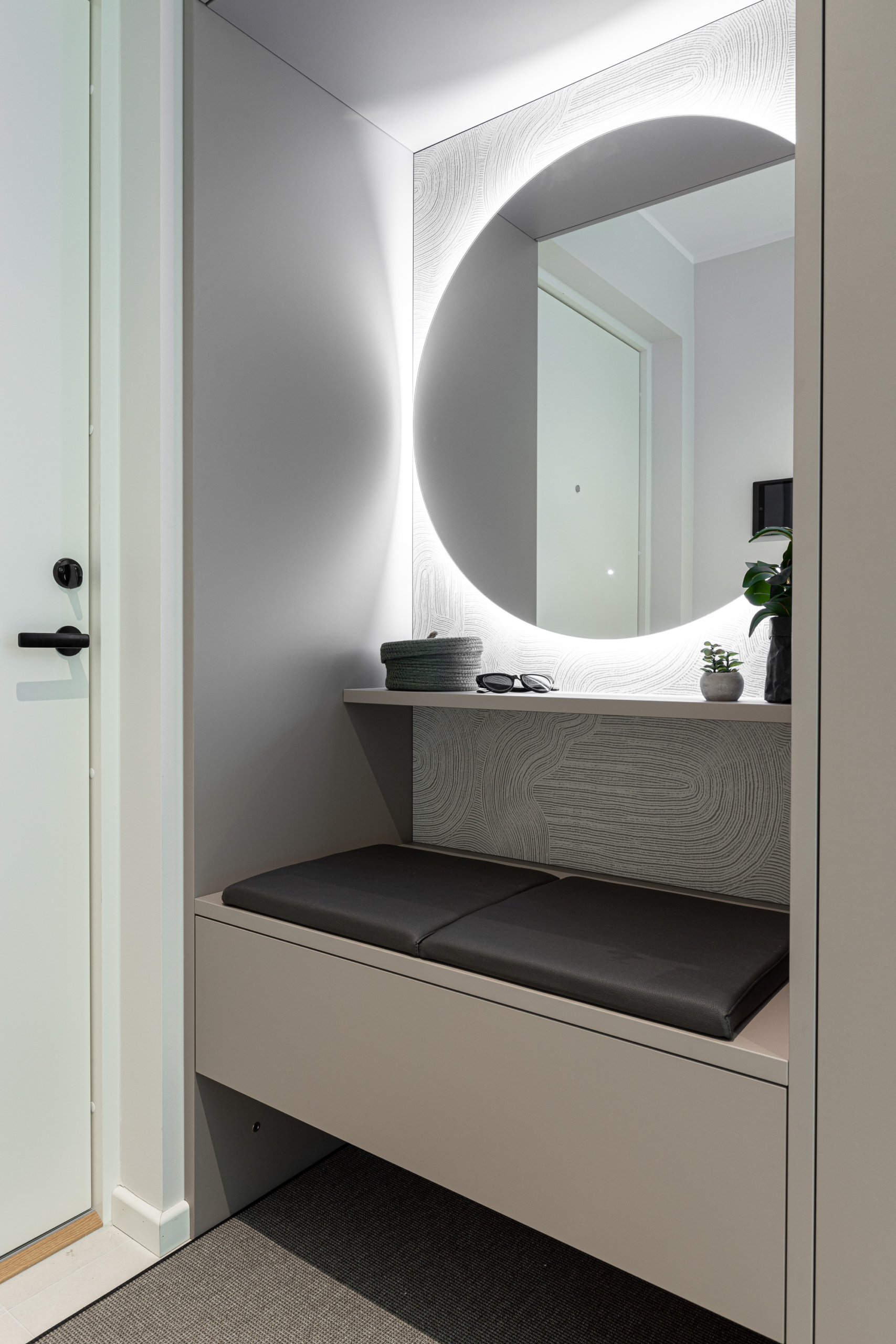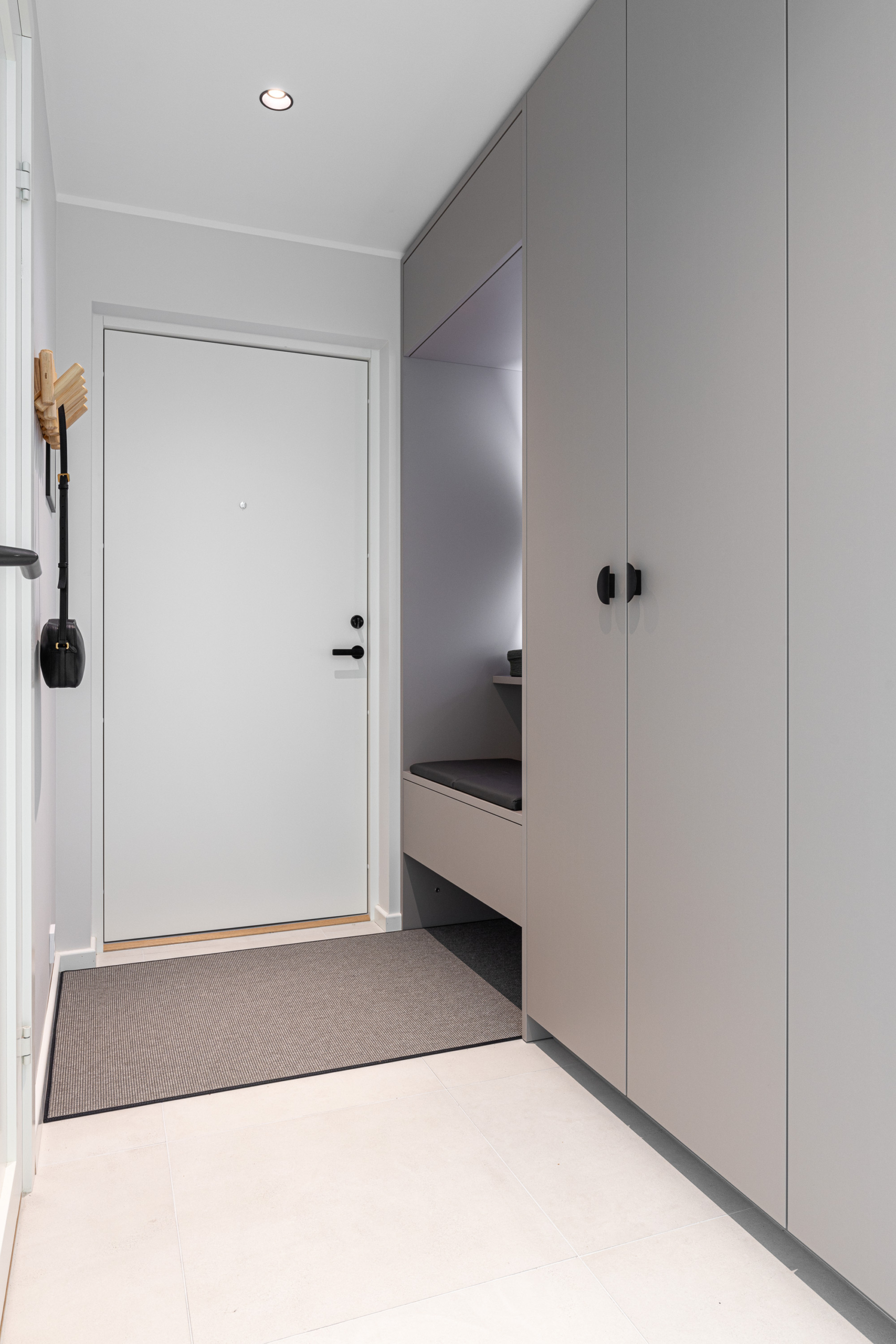 Sisenedes avaneb suisa pidulik vaade elutuppa, kuid ka esik on hoolikalt läbi komponeeritud. Neutraalsema tooniga Schmidti garderoobikappide rivis on süvend pingi ja peeglilaua jaoks, taustal delikaatne vihje zen aia rehamustrile. Funktsionaalsele ruumikasutusele lisab oma panuse erimõõdus tellitud Narma porivaip.