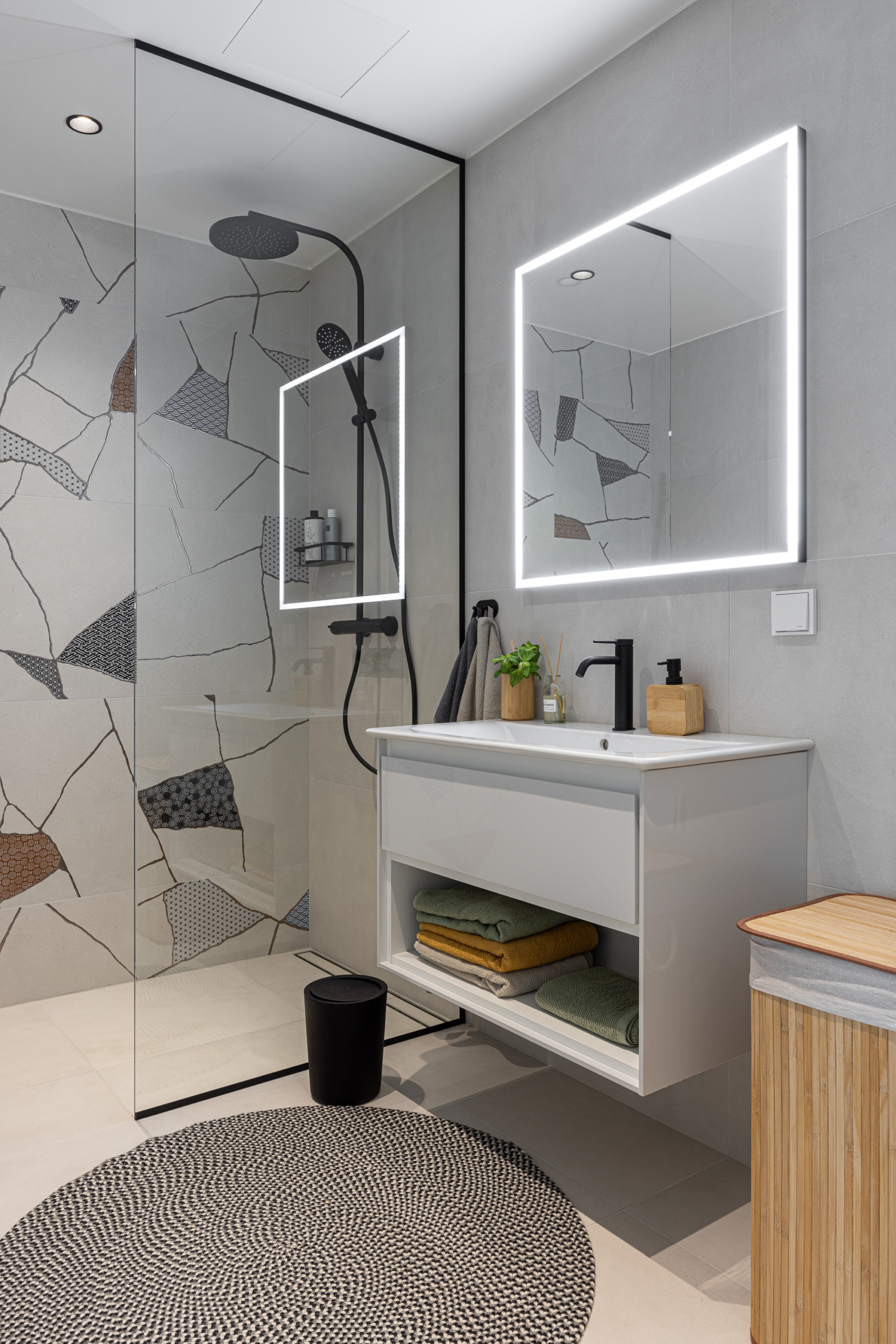 San. ruumid on Merko poolt juba Ideal Standardi valamukappidega varustatud, omalt poolt sai lisatud pehmust Perenne salongi PET-vaipadega ehk plastpudelitest ümbertöödeldud pestavate tekstiilidega ning mõne dekoorelemendiga, näiteks Wanderwalli raamitud poster puitriiulil.
