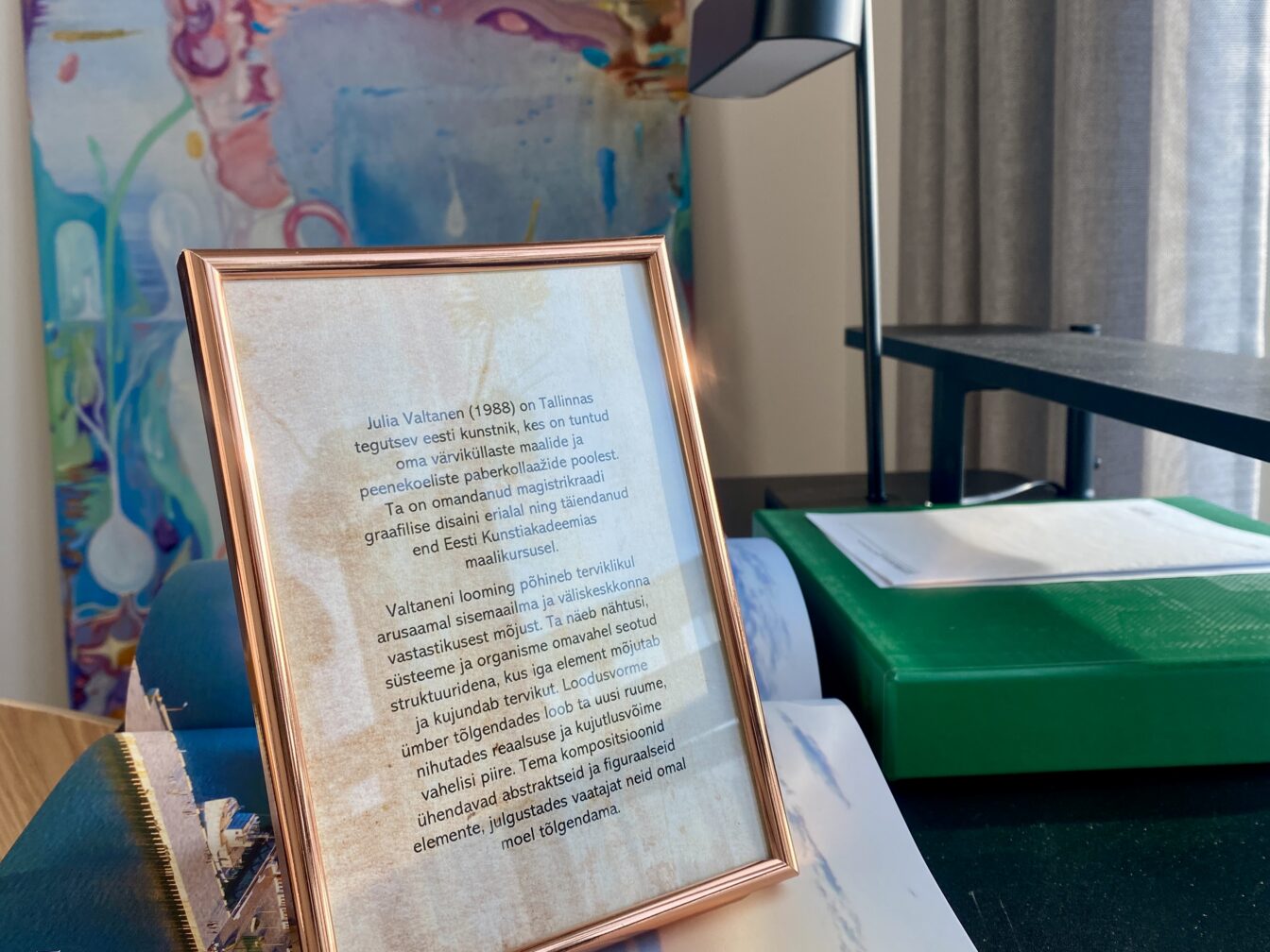 Sisustuse koloriit on nauditavalt naturaalne, et siiski mitte värvivaene – tooni annab jahedam salvei- ja soojem samblaroheline, särama panevad interjööri laia varjundiskaalaga vase-, messing- ja pronksitooni metalldetailid ning sügavuse loob musta-valge kontrast. Naturaalne hele tammepuit selle sees. Tugeva rahuliku fooni tekitab võrgulise struktuuriga merehall kardinakangas Texstudiost. Mööbli osas on tehtud võimalikult kohalikud valikud – rõõm nii keskkonnale kui ka siinsele majandusele.